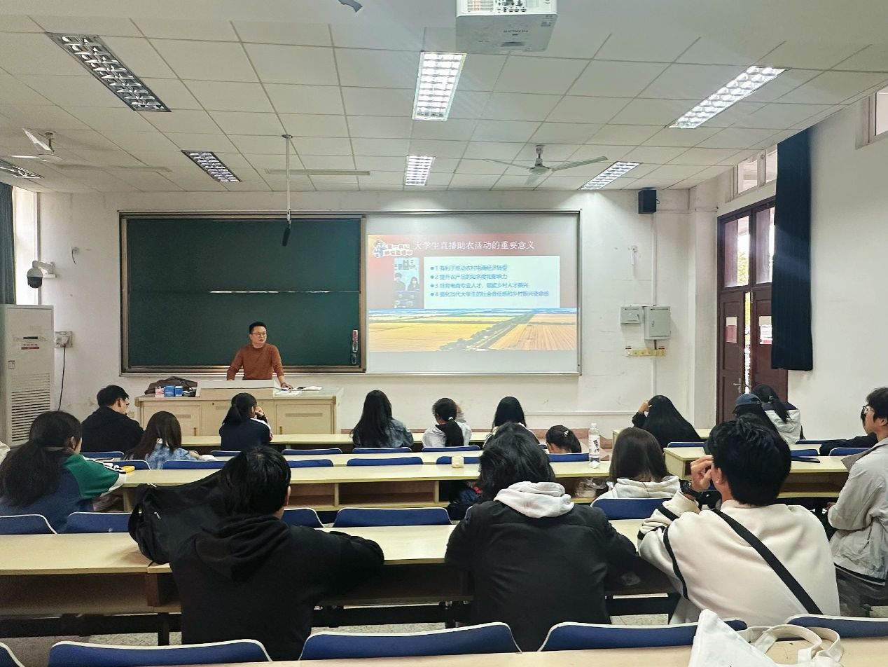 作为南财大党委组织部推荐、省委组织部选派的驻村干部,胡新蕲扎根乡村期间,带领村民成立丰县首家党支部领办合作社,通过盘活闲置土地、打造“桃醉陈楼”品牌、开展直播带货等举措,实现村集体与村民双增收,累计销售萝卜、鲜桃等农产品十余万斤,曾斩获徐州市人才下乡组别一等奖等多项荣誉。讲座中,他以“乡村振兴战略背景下第一书记与大学生直播带货助农实践”为主题,分享了从“胡老师”到“胡主播”的转型经历。