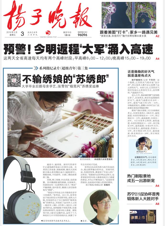 张雪还尝试将苏绣与现代科技结合,做出跨界融合的作品。苏绣耳机面、苏绣首饰等,都受到了年轻人的广泛欢迎。“我愿意为这份事业去努力,也希望更多的年轻人能够找到自己喜爱的事业,并为之不断地奋斗。”这是张雪的寄语,也是他对同龄人的美好期待。