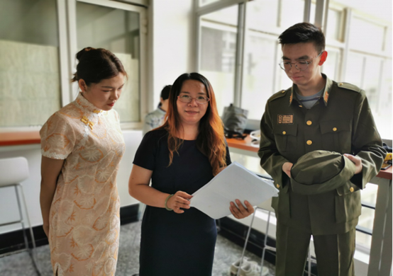 演员阵容由外国语学院和艺术设计学院的同学共同组成,从策划到演出历时一个月有余,每位同学都将角色演绎得入木三分。饰演顾晓梦的徐欣悦告诉记者,此前也没有什么舞台经验,只是看过一些抗战剧,在一次次和其他同学的排练、磨合过程中,感同身受共产党人为了民族大义,甘于忍辱负重,甘于流血牺牲,自己心中的那股热血也被点燃。