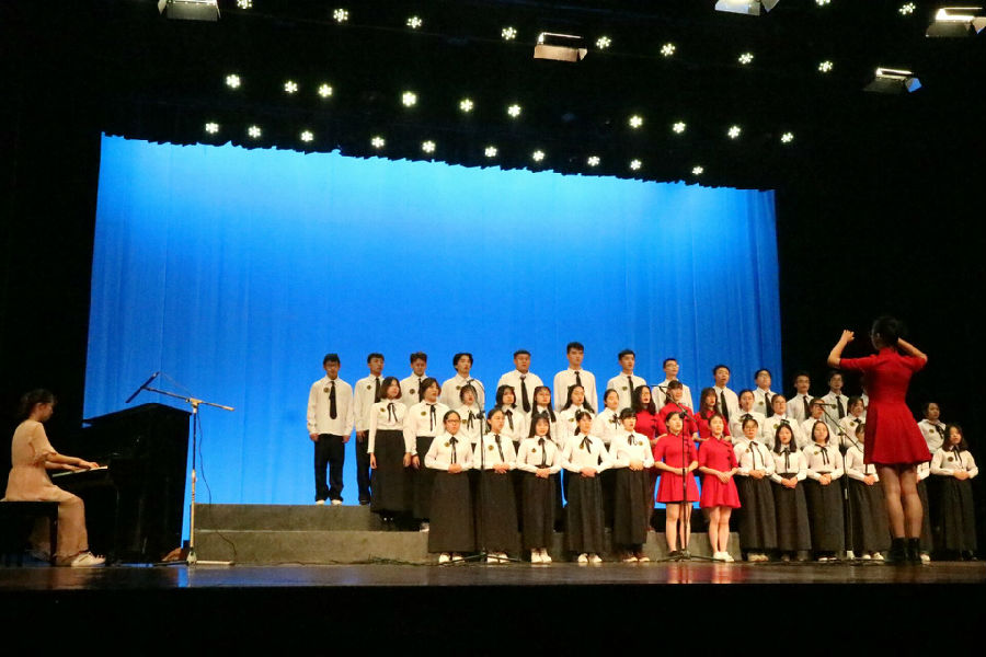 正式比赛前,会场播放了一段记录我国改革开放40年来风雨辉煌的沙画视频,在雄壮的中华人民共和国国歌声中,合唱比赛拉开帷幕。