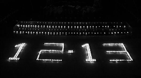 12月11日下午,由校团委、校青年志愿者协会主办的国家公祭日悼念仪式在仙林校区大学生活动中心前广场举行。各学院代表及部分师生参加了此次活动。参加活动的同学们身着深色衣服,庄严肃穆。志愿者代表首先发言,呼吁大家以史为鉴,发扬爱国精神,凝聚国家和民族的信念与力量。接着,大家依次点燃地面上摆成“12•13”样式的蜡烛,点亮烛光,缅怀逝者。最后,大家在横幅上庄重地签上自己的名字,一起为南京大屠杀中遇难的同胞们和为祖国牺牲的革命英烈默哀。