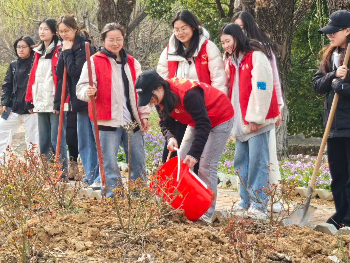 经济学院于博远楼南侧月季园开展植树活动。在专业园丁指导下,志愿者们分组协作,挥锹培土、扶苗定根、提水浇灌,共同栽种月季、桂花等苗木,并为每株树苗悬挂专属“心愿牌”。随后,志愿者们对园区杂草进行全面清理,将姓名书写于天然落叶并粘贴至签名板,寓意“化枯叶为新生”,传递循环共生的环保理念。