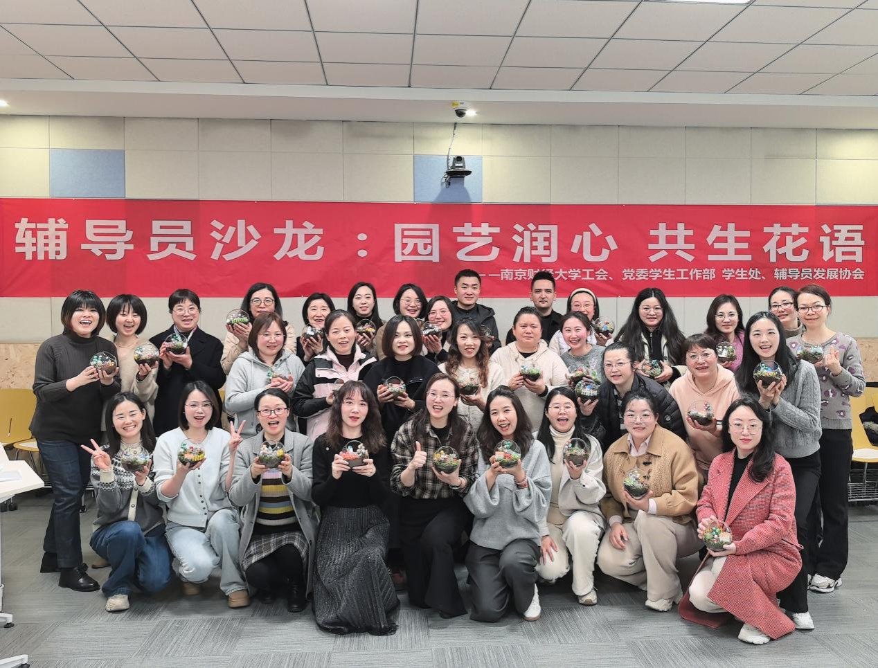 由校工会主办、学生处协办、辅导员发展协会承办的“园艺润心·共生花语”活动在博文楼101智慧教室开展。40余名专职辅导员在园艺师的指导下,化身“巧手花匠”,发挥创意,精心挑选植物、搭配色彩、设计造型,将一棵棵形态各异的多肉植物组合成一个个独具匠心的迷你盆景,不仅展现了辅导员们的巧思妙想,也寄托了大家对美好生活的向往和对教育事业的热爱。