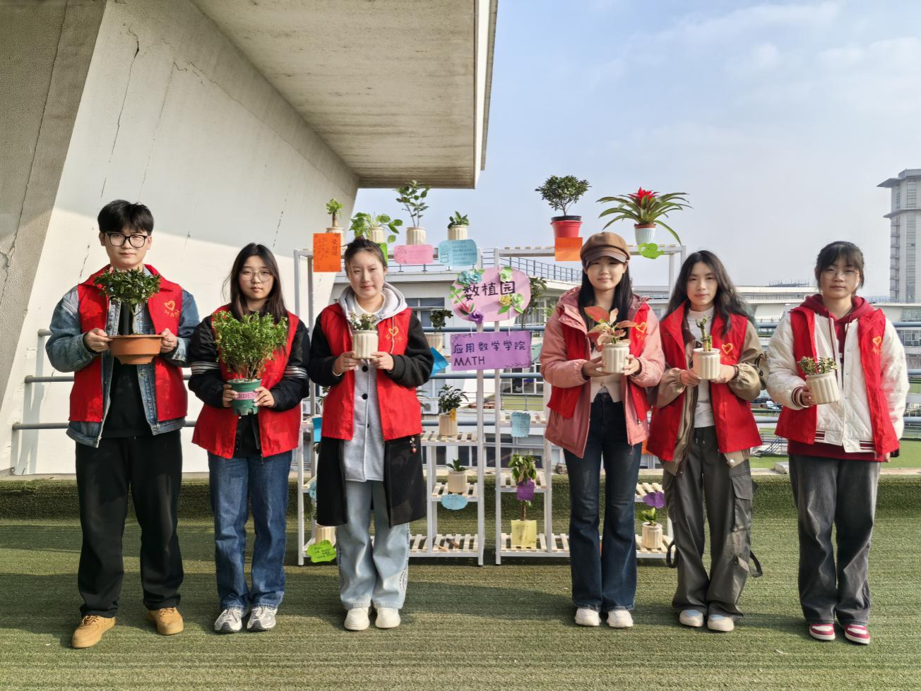 应用数学学院开展了绿植科普课堂,帮助同学们了解各类植物的生长习性与养护诀窍;绿植认领环节,同学们用不同颜色的彩笔和卡纸,精心勾勒、细致书写,为每一盆绿植量身定制专属卡牌;绿植景观共建环节,同学们齐心协力,将绿植搬运至花架上,并贴上精心制作的卡牌。20余盆植物错落有致地陈列于平台之上,构成了一道亮丽的风景线,为校园增添了绿意和生机。