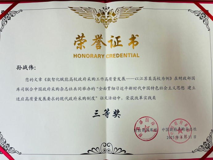 5月13日,财政部国库司、中国政府采购杂志社公布“全面贯彻习近平新时代中国特色社会主义思想 建立适应高质量发展要求的现代政府采购制度”征文获奖名单,伟德官网选送的作品《数智化赋能高校政府采购工作高质量发展——以江苏某高校为例》获改革实践类三等奖。