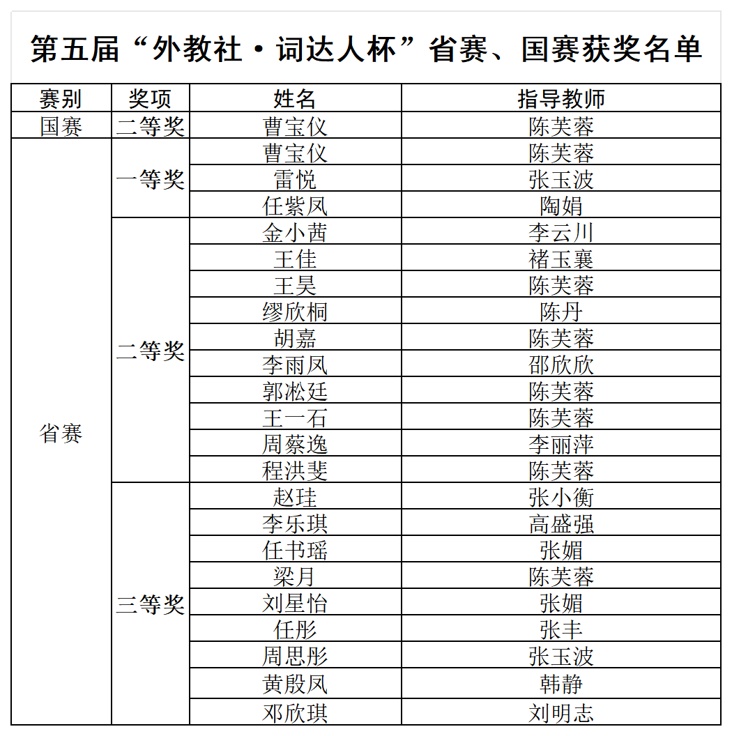 近日,第五届“外教社·词达人杯”全国大学生英语词汇能力大赛落下帷幕,来自全国1635所院校共计2095位学生参赛,经过激烈角逐,伟德官网营销2023级曹宝仪同学荣获全国二等奖。