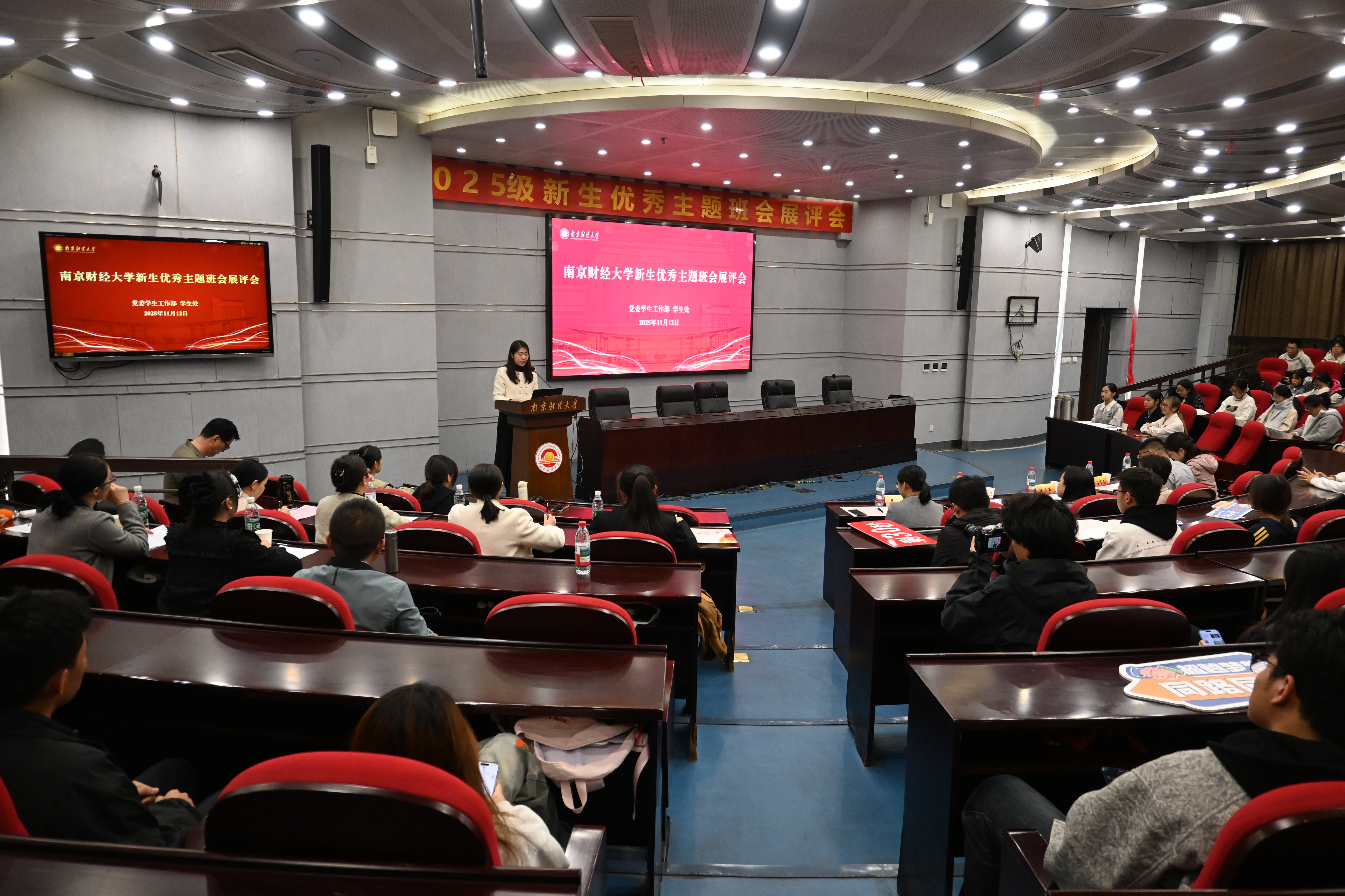 11月12日晚,伟德官网在仙林校区行政楼二楼报告厅举办2025级新生优秀主题班会展评会。南京师范大学学工部副部长、学生处副处长汪育文,伟德官网党委学生工作部部长、学生处处长韩力争,校团委书记张蔚伟,心理健康教育中心副主任吴垠,党委学生工作部副部长、学生处副处长袁怡琨等担任评委。全体本科生新生辅导员和本科生新生班级学生干部代表到场观摩学习。展评会由工商管理学院新生辅导员赵雪主持。