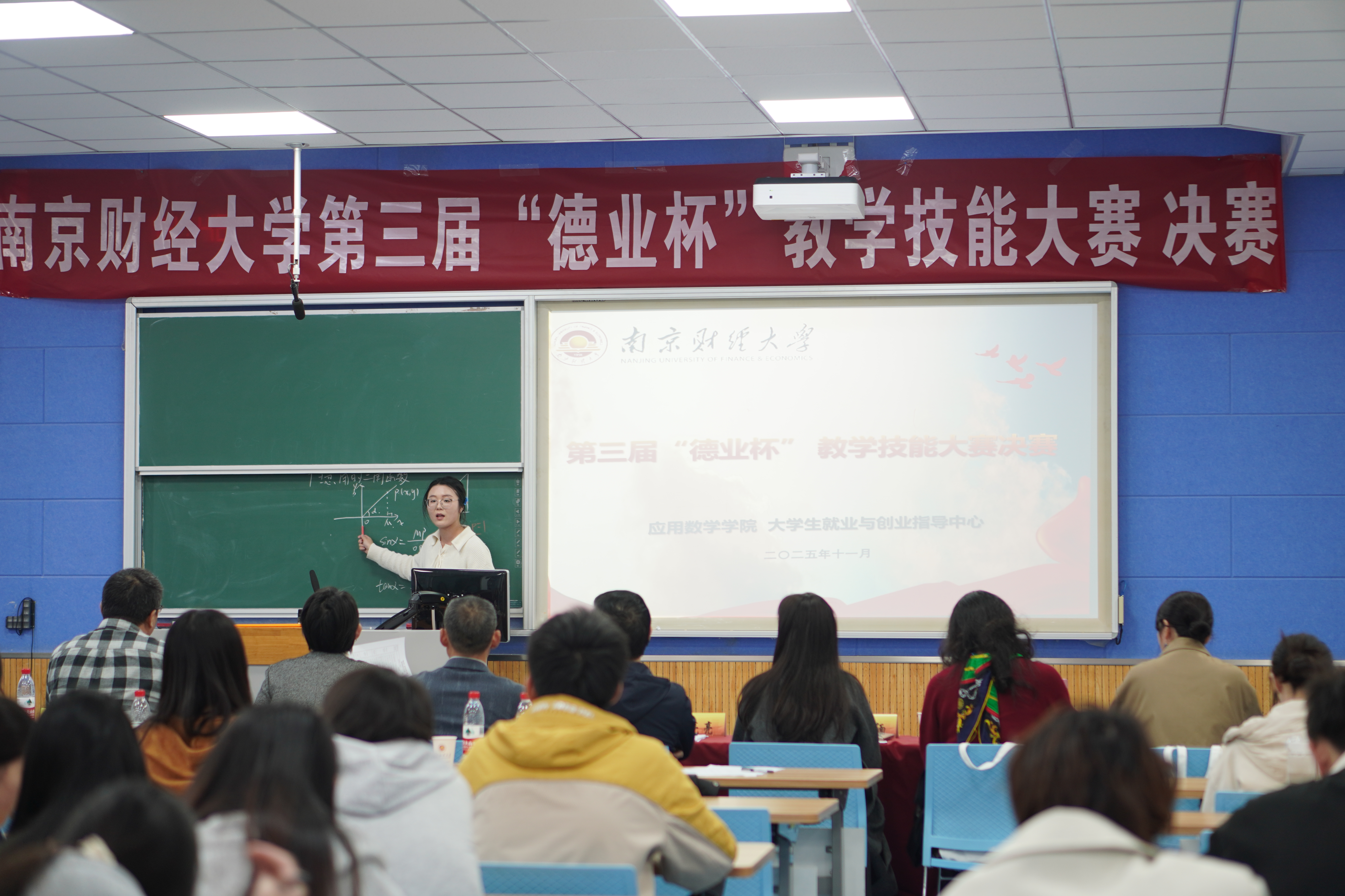 11月15日下午,由应用数学学院主办的第三届“德业杯”教学技能大赛决赛在仙林校区博文楼JA105多功能教室举办。江宁高级中学校长张格波、栖霞中学校长吴玉珠、南师附中秦淮科技高中副校长龚亮亮、江宁高级中学福宁路校区副校长黄宣忠、南京市三牌楼小学副校长张缅、南师附中仙林学校小学部副校长刘伟、南京外国语学校明远小学副校长高小娣、南京育英外国语学校高级教师王士云、南师附中仙林学校小学部主任张长梅、伟德官网学生处副处长李慕原担任评委。全校研究生与本科生代表到场观摩学习。决赛由应用数学学院院长方国昌主持。