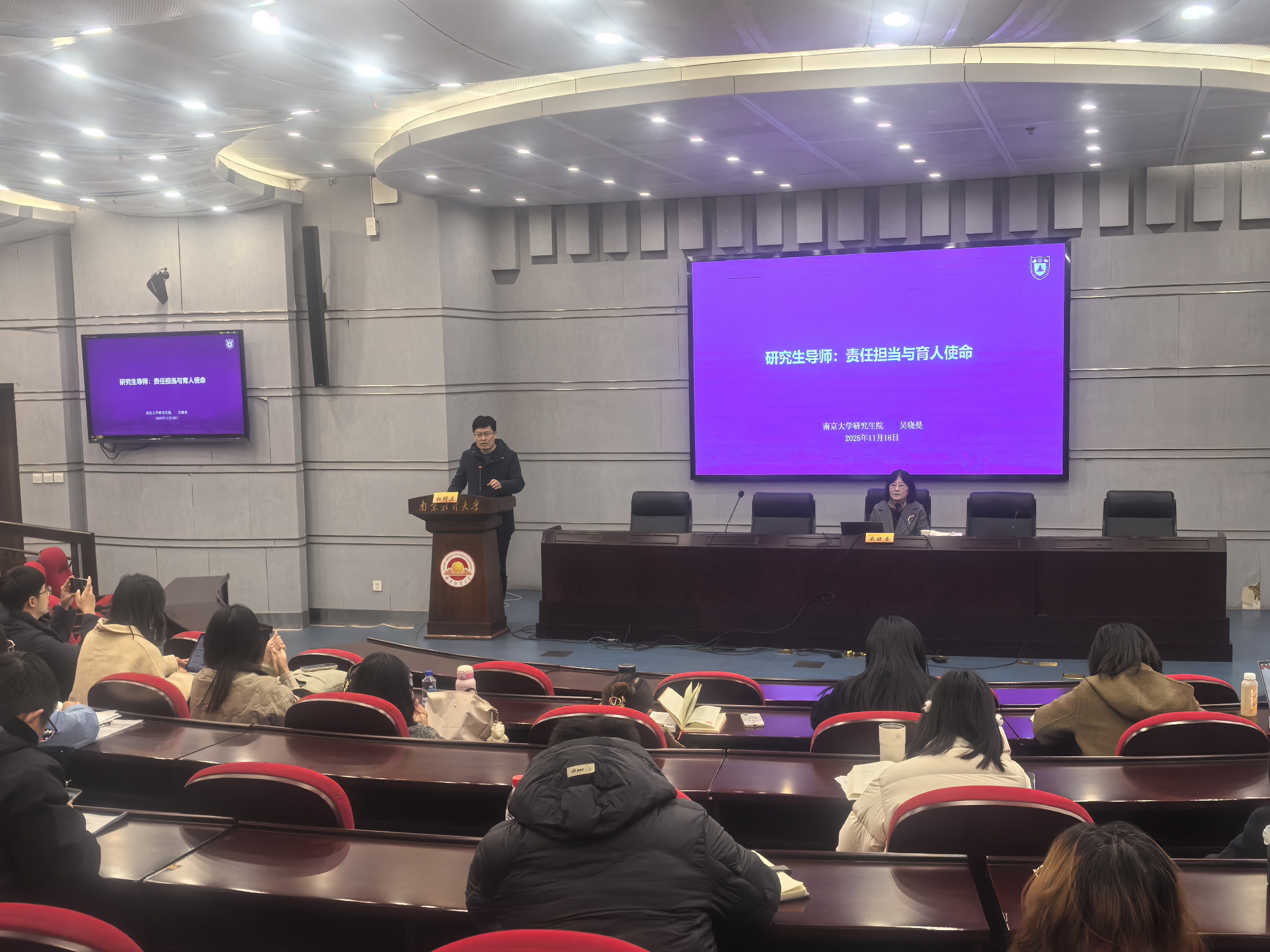 11月18日下午,伟德官网2025年新增研究生指导教师培训会在仙林校区行政楼二楼报告厅举办。本次培训特邀南京大学研究生院副院长吴晓曼、伟德官网心理健康教育中心教师李喆君担任主讲嘉宾。2025年新增博士、硕士研究生导师及研究生院相关工作人员参加培训会。会议由研究生院副院长、学位办副主任杜修立主持。