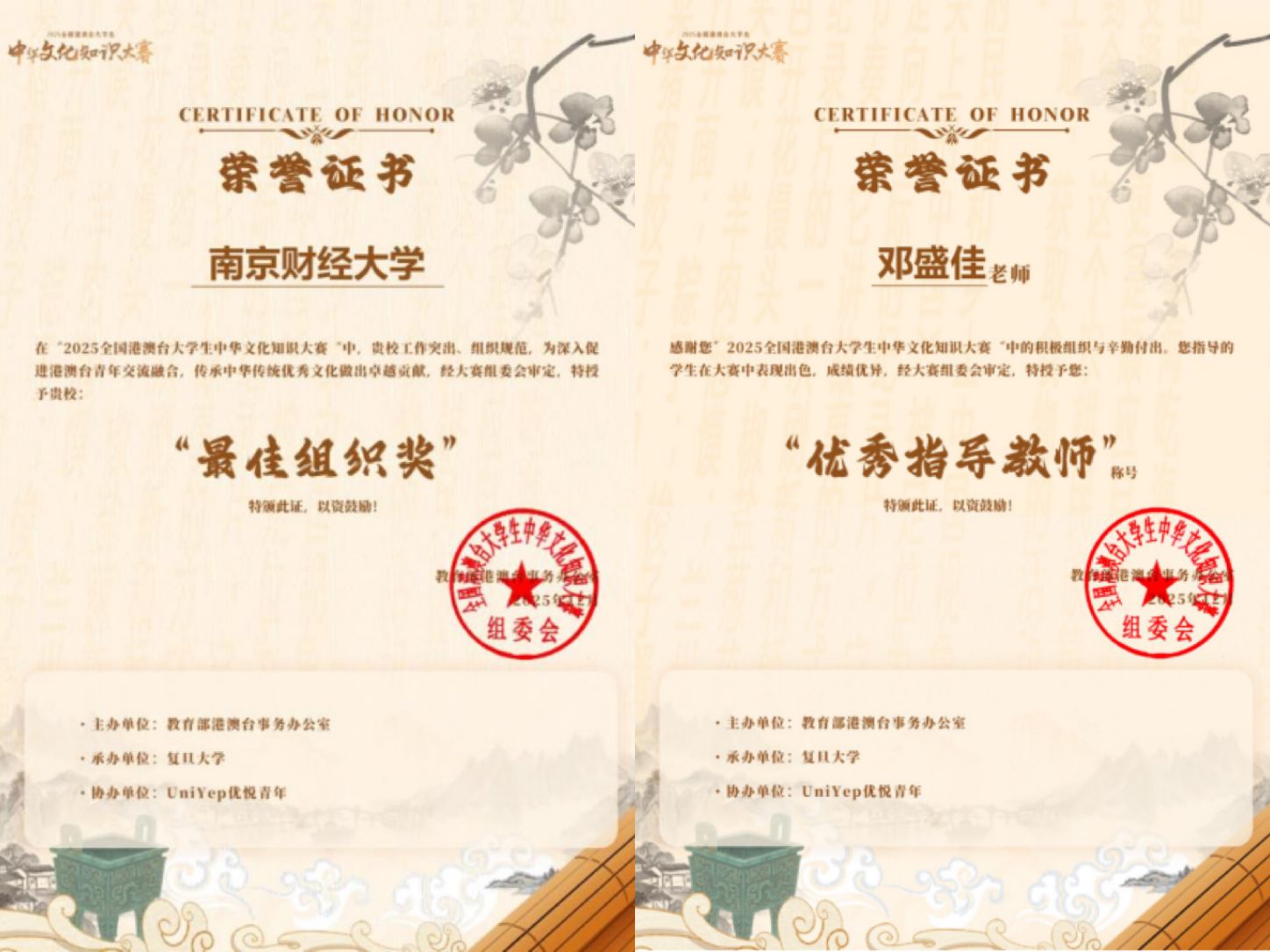 近日,教育部港澳台事务办公室传来喜报,伟德官网在2025全国港澳台大学生中华文化知识大赛中工作突出、组织规范,获“最佳组织奖”,国际经贸学院邓盛佳老师获评“优秀指导教师”。