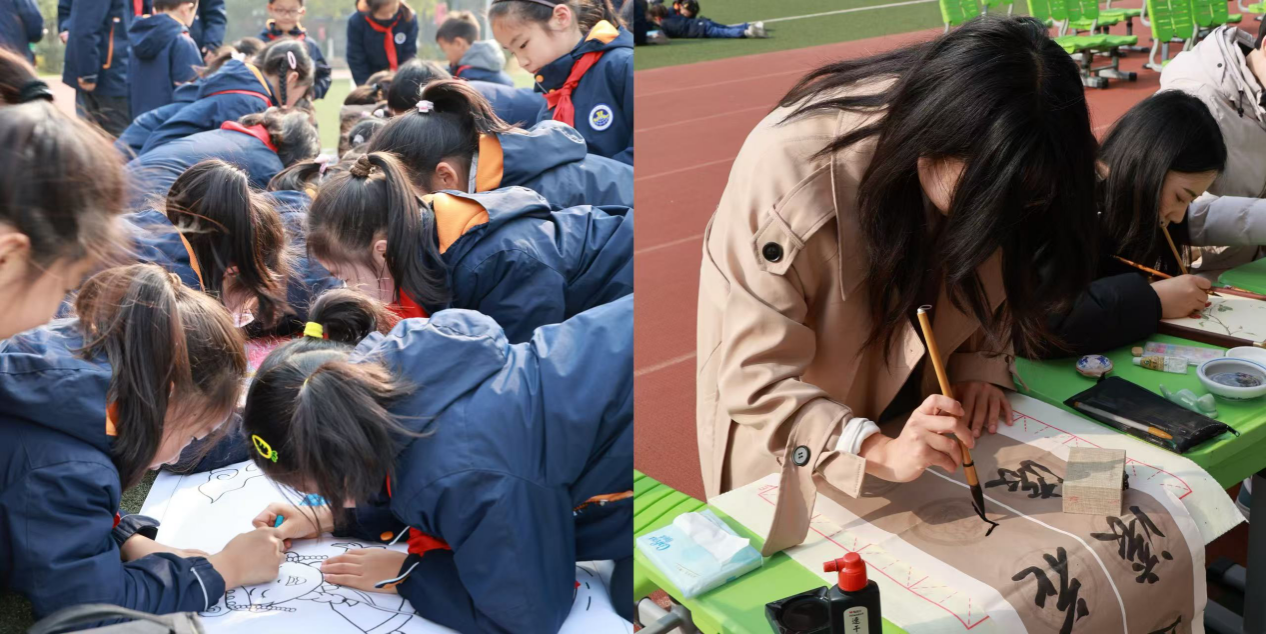 师生们共同观看了一系列展现我国各民族风貌的视频与图文介绍。随后的互动问答环节,大家踊跃发言,在轻松愉悦的交流中进一步理解了“中华民族一家亲”的深刻意义。书画实践环节,随着《中华民族一家亲》音乐声响起,操场中央一幅洁白的长卷徐徐铺开。小学生们用充满想象的笔触,勾勒出鲜艳的民族服饰、欢快的舞蹈人物;大学生们则以“民族团结一家亲”为主题进行书画创作,共绘中华民族共同体意识的时代画卷。