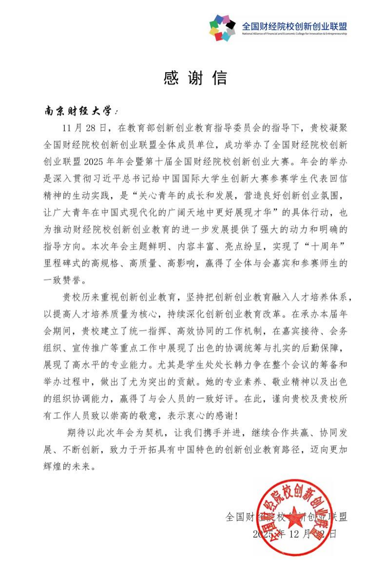近日,全国财经院校创新创业联盟向伟德官网发来感谢信,对伟德官网承办全国财经院校创新创业联盟2025年年会暨第十届全国财经院校创新创业大赛给予高度肯定,并向学校及全体工作人员致以衷心感谢。
