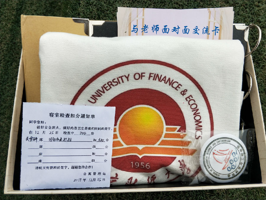 小福袋装载的是定制的南财校徽帆布包、用心制作的南财相册、管工院院徽、贴心的“与老师面对面”交流卡、宿管站扣分卡、英语四级试卷。南财相册上写着:“无论相隔有多远,母校对你的思念永不停歇”“风里有花香,身边有我们最爱的人”“铲屎官,你打算什么时候回来看看朕呢?”这些贴心温暖的物件、话语像时光机一样让人仿佛瞬间回到了从前。前期学生会还录制了《无问西东》视频,在图书馆、教学楼、食堂、大学生活动中心、宿管站等校园各个角落播放,以这种特殊的方式带领校友们重温南财岁月。