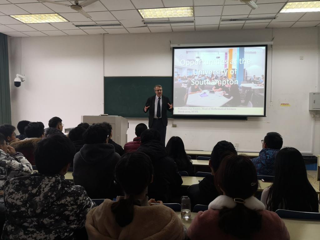 Foster教授主要从南安普顿大学及其数学学院基本情况、两校4+1、2+2及其3+1项目、南安普顿大学数学学院课程安排及其研究方向、南安普顿大学数学学院毕业生就业及未来发展方向等四个方面进行了详细的介绍与讲解。Foster教授介绍南安普顿大学是世界百强名校、英国老牌名校,主校区坐落于英格兰南安普顿,享有知名的国际声誉。在2018年TIMES数学专业英国大学排名中,南安普顿大学数学专业排名第17名。南安普顿大学数学专业研究方向有经济、生物、天体物理和纯数学方向。Foster教授指出,南安普顿大学数学学院的课程设置与我院的培养方案非常相近,衔接度高,非常契合我院学生的学习和生涯方向。Foster教授态度谦和、风趣幽默,讲座中表达了对有意愿到南安普顿大学交流及深造的同学的欢迎,激发了在座师生对南安普顿大学的浓浓兴趣。讲座结束之后,Foster教授对大家提出的留学深造问题进行了耐心的解答,并真诚邀请大家能到南安普顿大学交流与深造。