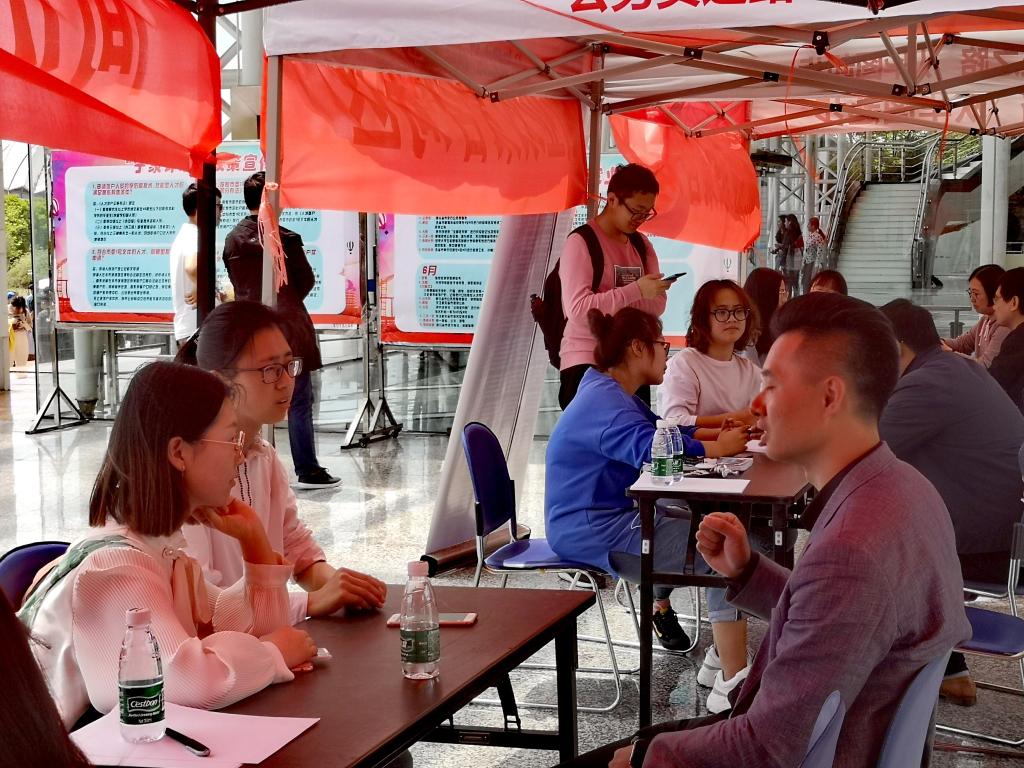 4月18日中午,由伟德官网大学生就业与创业指导中心联合心理健康教育与咨询中心、职业发展与就业协会、创新创业联合会共同举办的“‘职’为遇见你,‘创’进我心‘理’”就业创业广场咨询服务活动在仙林校区大学生活动中心前广场开展,现场人头攒动,热闹非凡。