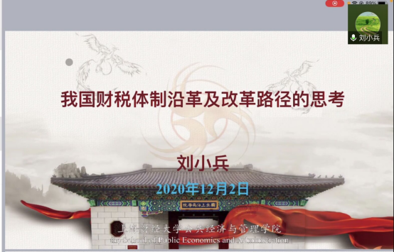 12月2日晚,应财政与税务学院、公共财政研究中心邀请,上海财经大学公共经济与管理学院院长、中国卫生经济学会副会长、全国高校财政学教学研究会副理事长、中国财政学会理事、上海市曙光学者刘小兵通过腾讯会议作了题为“我国财税体制沿革及改革路径的思考”的学术报告。学院部分教师和全体硕士研究生聆听讲座。讲座由财政与税务学院院长朱军主持。