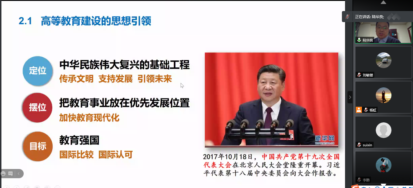 关于专业建设的国家意志和省级举措方面,陆华良教授强调了专业建设对于高校发展的重要意义,介绍了专业发展的历史溯源,回顾了国家特色专业建设进程,以及江苏省级层面对于专业建设的政策沿革。他认为,专业是高等院校联系社会、服务社会的纽带,是保证人才培养适销对路的首要和关键环节。关于高校教育建设的思想引领和行动指引方面,他认为从本科教学向本科教育的转变表明人才培养在形式、认识、地位等方面都发生了根本性的变化。随后,陆华良教授对高校教育管理、高校课堂教学管理的现实困境进行详细分析,并结合常州大学人才培养和专业建设多年的改革实践经验,提出了具有针对性的解决方案。讲座最后,陆华良教授和参会老师进行了热烈交流互动,就老师们提出的专业建设、课程设计、实验实践教学中存在的问题与困惑一一给予了细致解答。