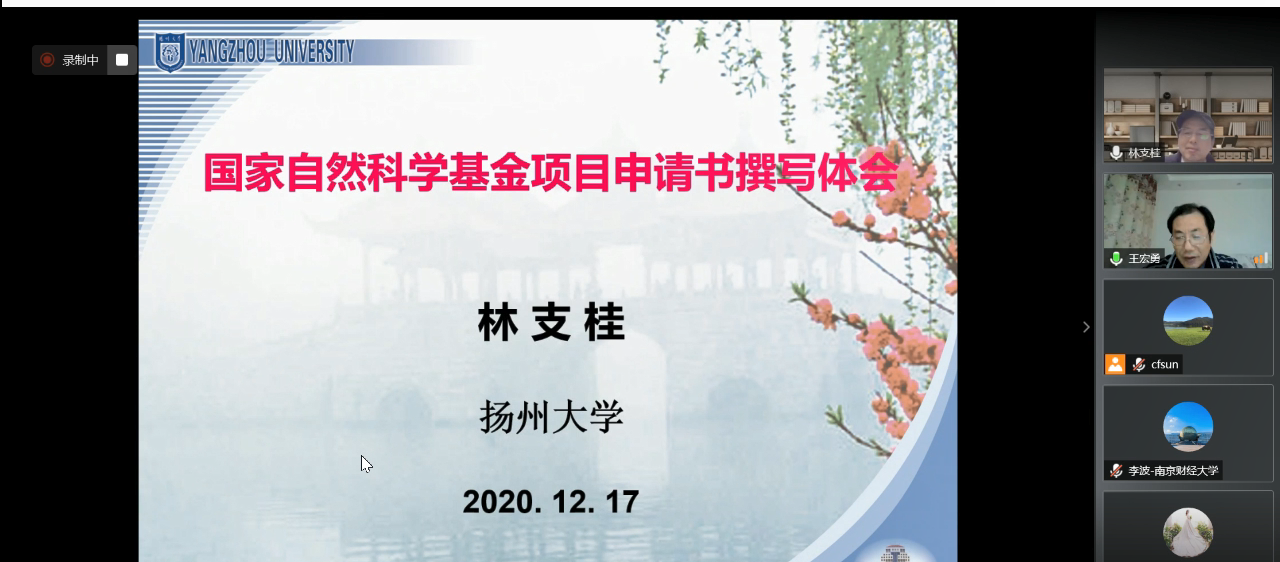 12月17日晚,应应用数学学院邀请,扬州大学数学科学学院教授林支桂通过腾讯会议作了题为“国家自然科学基金项目申请书撰写体会”的讲座。应用数学学院老师聆听了此次讲座。讲座由应用数学学院院长王宏勇主持。
