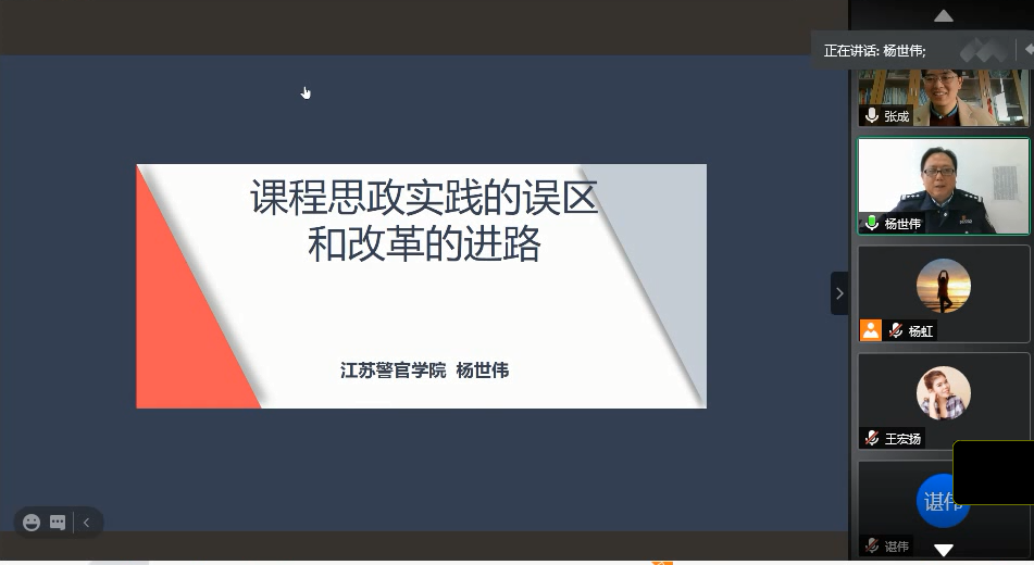 12月18日中午,应金融学院邀请,江苏警官学院教务处副处长杨世伟通过腾讯会议作了题为“课程思政实践的误区和改革的路径”的讲座。讲座由金融学院副院长(主持工作)张成主持,副院长郭文旌、刘敏楼、姚定俊及各系正副主任和课程负责人聆听了讲座。