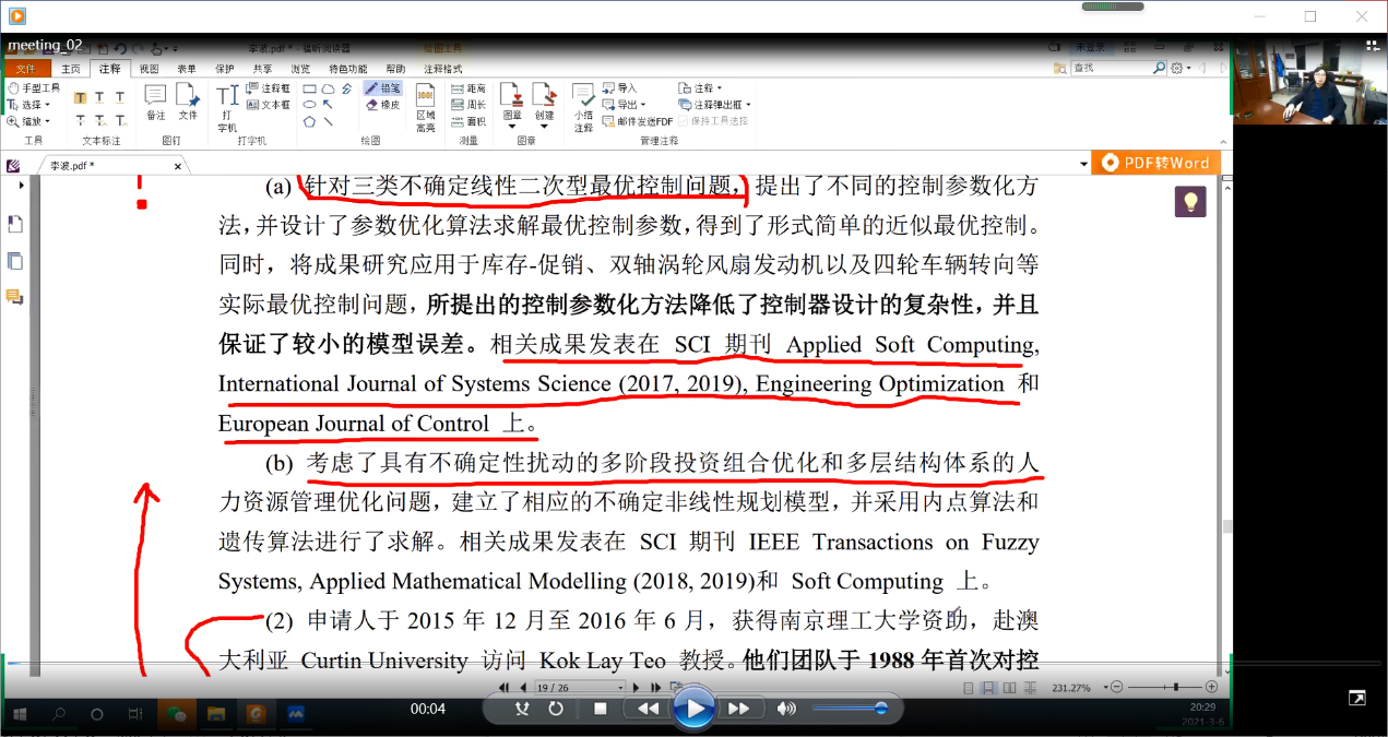 尹会成教授以会评专家组组长经历,讲述了申报书上会的基本原则以及各个申请代码的竞争激烈程度,要求申报老师紧跟国家热点和学科前沿焦点,沉下心,争取写高质量的论文,为申报书打下扎实的基础。评审交流会中,老师逐个对自己的申报书作线上汇报,尹会成教授仔细听取报告,并对每份申报材料给出一对一建设性意见。