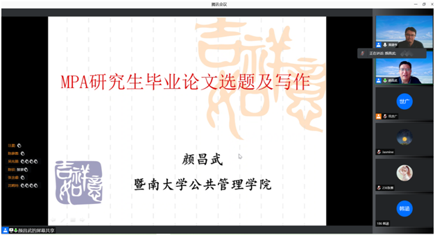 10月31日下午,应公共管理学院邀请,暨南大学公共管理学院博士生导师、中国行政管理学会理事颜昌武教授为公共管理学院师生开展了题为“MPA研究生毕业论文选题及写作”的线上讲座。公共管理学院副院长(主持工作)、MPA教育中心主任黄建伟教授主持讲座,公共管理学院部分教师以及MPA研究生、部分学术型研究生聆听了讲座。