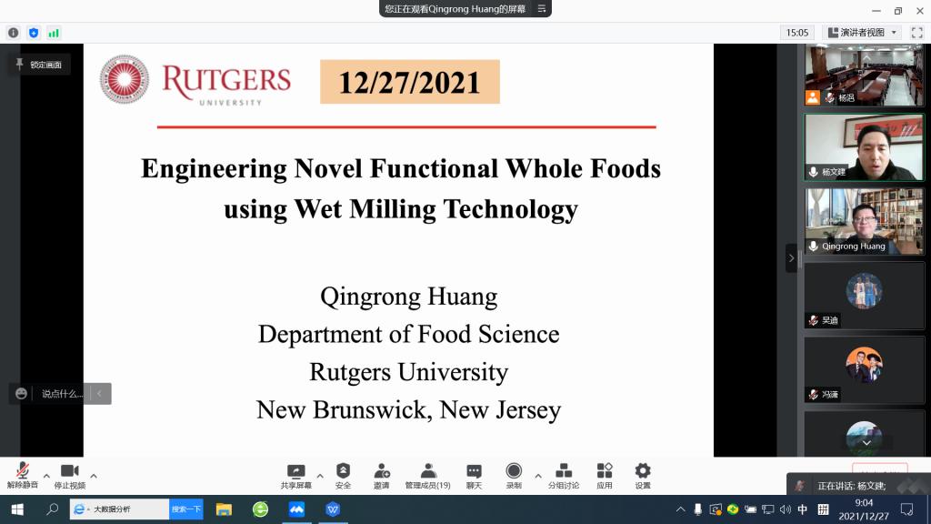 12月27日,应食品科学与工程学院邀请,美国罗格斯大学教授黄庆荣于线上为伟德官网师生作了题为Engineering whole grain emulsion gels using wet milling technology的学术报告。食品科学与工程学院部分师生参加报告会。报告会由科研处副处长杨文建教授主持。