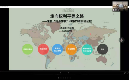 汤玉刚教授以济南市曾经实施的“定点学校”政策为例,通过房地产市场的反应间接评估该政策的潜在社会影响,并基于学区边界的空间断点回归方法和渐进双重差分法对“定点学校”政策产生的居住隔离效应进行评估,发现该政策使得学区内二手房房价出现下跌。汤玉刚教授通过对不同户型进行异质性分析,发现大户型比小户型受该政策的影响更大。通过对政策取消效应和人口效应进行分析,发现在“邻里效应”和“同群效应”的驱动下居住隔离被强化。最后,汤玉刚教授就课题选题问题与师生进行探讨。