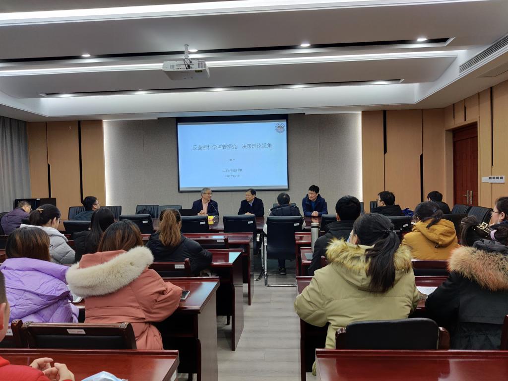 1月5日上午,应国际经贸学院邀请,山东大学经济学院教授林平在仙林校区德经楼308会议室作了题为“反垄断科学监管探究:决策理论视角”的学术讲座。讲座由国际经贸学院院长宣烨主持。科研处副处长杜修立、国际经贸学院副院长余泳泽、粮食和物资学院副院长杨向阳、部分青年教师及研究生聆听了讲座。