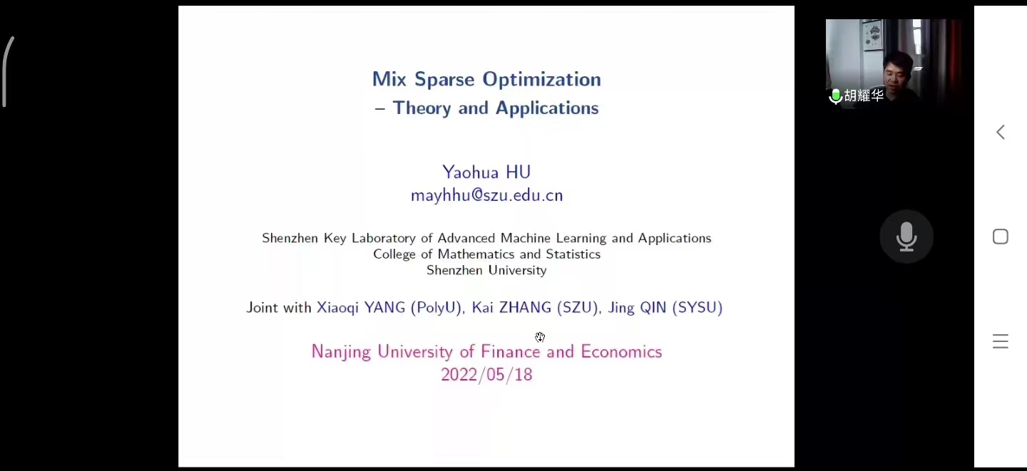 5月18日下午,应应用数学学院邀请,深圳大学胡耀华副教授通过腾讯会议作了题为“混合稀疏优化:理论与应用”的线上学术讲座。学院硕士研究生、部分教师参加讲座。
