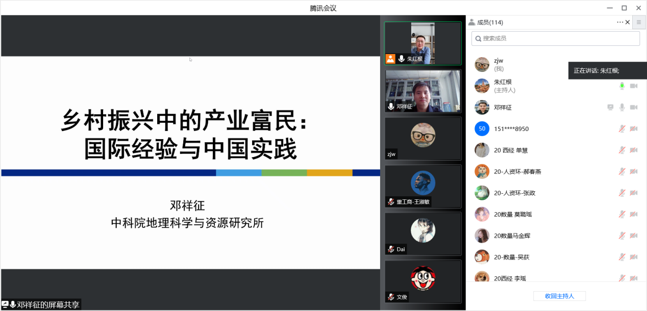 5月20日下午,应经济学院邀请,中国科学院地理科学与资源研究所邓祥征研究员在线作了题为“乡村振兴中的产业富民:国际经验与中国实践”的学术报告。报告由经济学院院长朱红根教授主持。来自各多个学院的100多位师生聆听讲座。