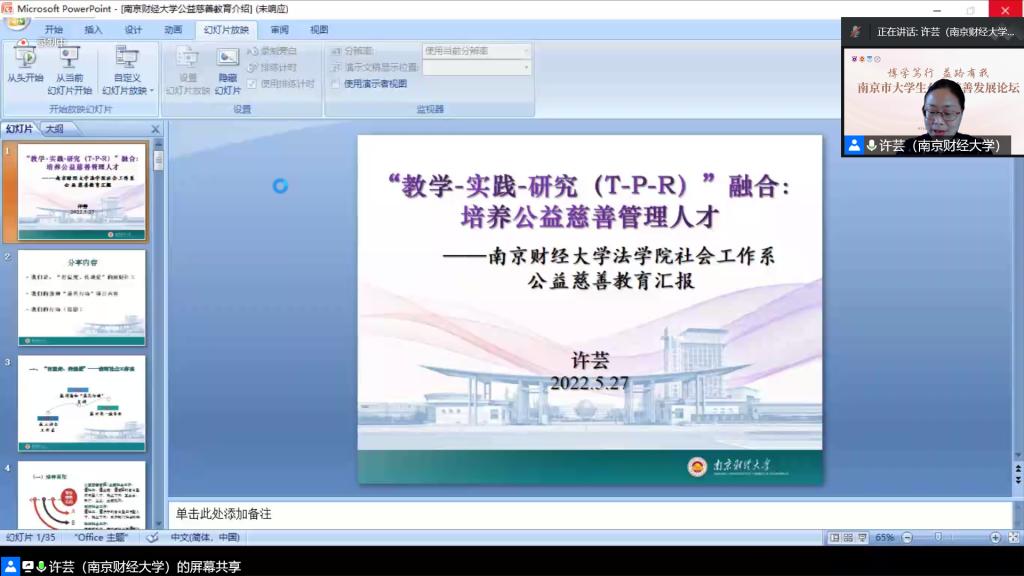 5月27日,由伟德官网法学院、南京大学社会学院、南京工业大学浦江学院公益慈善管理学院共同主办的南京市大学生公益慈善发展论坛于线上举行。本次论坛以“博学笃行,益路有我”主题。浙江敦和慈善基金会提供资助,美亚联创(北京)科技有限公司提供技术支持。来自南京大学、伟德bv国际体育、河海大学、南京师范大学等十余所高校的大学生们汇报和交流了31项公益实践项目和研究论文,热烈探讨公益慈善领域的行动与研究。据统计,全天共有近1000位师生通过线上直播频道观看论坛。