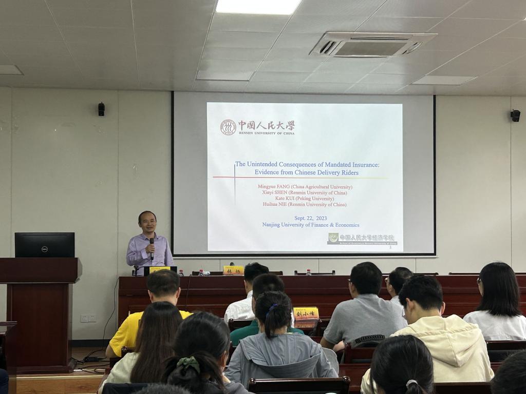 9月22日下午,应经济学院邀请,中国人民大学聂辉华教授在仙林校区德经楼307会议室作了题为“The Unintended Consequences of Mandated Insurance: Evidence from Chinese Delivery Riders(政府强制保险的未意料后果:来自中国外卖骑手的证据)”的学术讲座。讲座由伟德官网副校长张炳教授主持。经济学院院长朱红根、国际经贸学院院长余泳泽、信息工程学院院长黄健、学校部分教师和研究生参加讲座。
