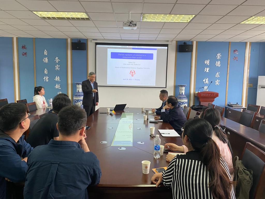 4月29日下午,应应用数学学院邀请,扬州大学刘祖汉教授在仙林校区德业楼508会议室作了题为"Partial regularity of the solution to a chemotaxis-fluid model"的学术讲座。讲座由应用数学学院院长方国昌教授主持。学院相关教师与研究生参加讲座。