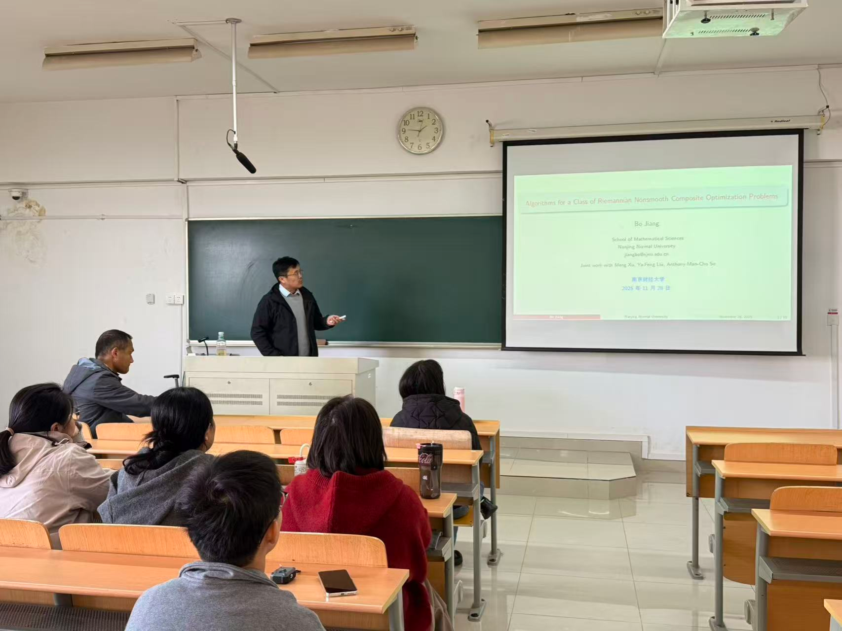 11月28日下午,应应用数学学院邀请,南京师范大学数学科学学院姜波教授在仙林校区博文楼408室作了题为“RADA: A Flexible Algorithmic Framework for Nonconvex-Linear Minimax Problems on Riemannian Manifolds”的学术讲座。学院相关教师和研究生参加讲座。