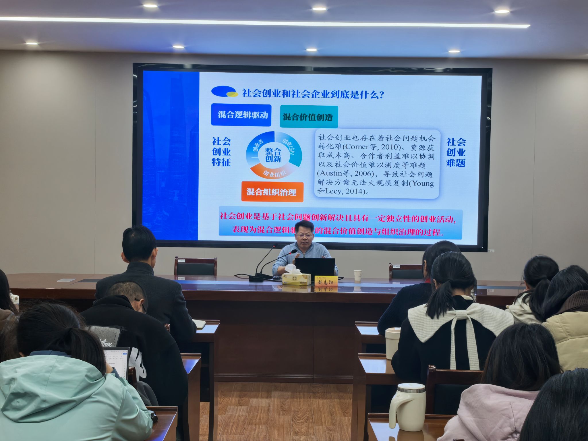 讲座中,刘志阳教授从社会创业的研究脉络与发展趋势切入,系统阐述了新时代背景下社会创业的理论内涵与实践意义。他围绕“社会创业是否等同于商业创业的社会化应用”“AI对社会创业的影响是否仅为技术延伸”等问题展开探讨,重点剖析了社会创业领域在概念界定、价值衡量、创新本质等十二个方面的理论分歧,并结合国内外前沿成果,指出该领域的发展趋势与研究热点。刘志阳教授强调,社会创业是推动社会创新、实现可持续发展的关键力量。随后,他详细介绍了资源动员、混合治理、价值共创等核心理论框架,并分享了社会企业成长的实际案例与研究方法。