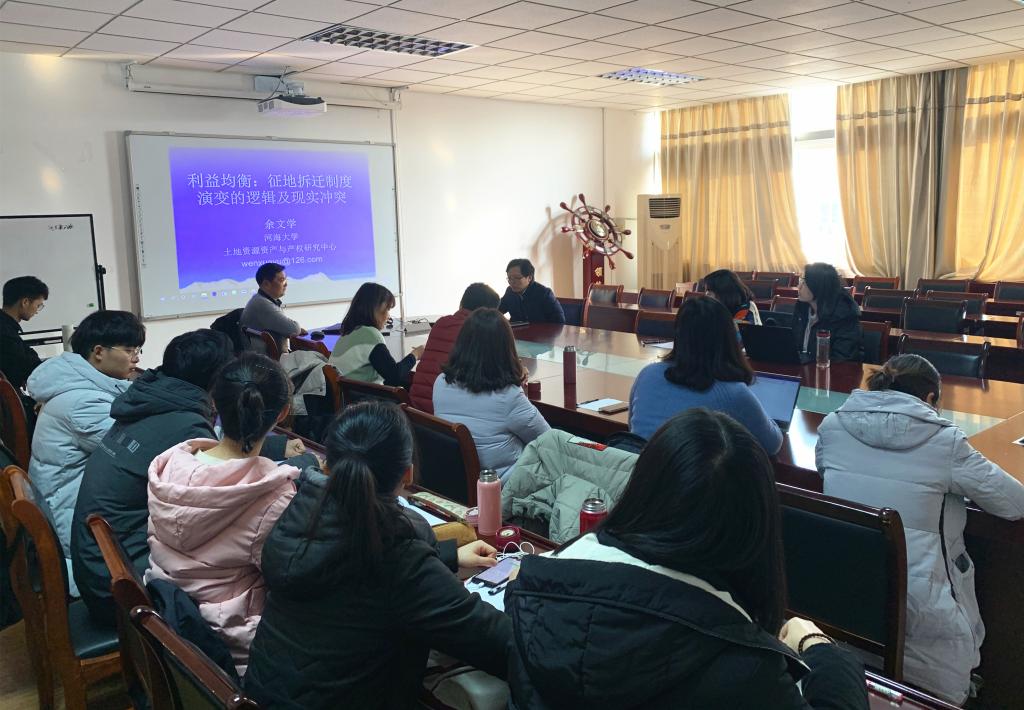 12月20日下午,应公共管理学院邀请,河海大学公共管理学院教授余文学在伟德官网仙林校区德济楼508会议室作了题为“利益均衡:征地拆迁制度演变的逻辑及现实冲突”的讲座。我院部分老师和研究生参加讲座,讲座由公共管理学院副院长李永乐主持。