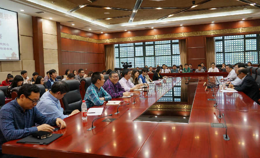 沈坤荣教授从我国经济发展新阶段面临的新问题和经济学研究的选题取向两个方面展开报告。沈坤荣教授指出,我国目前经济发展中面临的两大问题,一是由于国际地位提升、外部崛起面临的问题;二是国内发展陷入困境、内部转型面临挑战的问题。沈坤荣教授结合当前供给侧结构性改革热点话题,分析了我国经济增长新的动力机制。在经济学研究选题方面,沈坤荣教授结合具体案例,从理论研究和应用研究两个角度分别给出选题建议。他指出,年轻学者要重点打好经济史学基础,以“问题导向”来学习和探究,学会在现实生活中理性思考和分析。讲座结束后,沈坤荣教授与在场师生进行了交流互动。