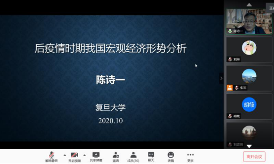 10月21日晚,应财政与税务学院、公共财政研究中心邀请,复旦大学经济学院党委书记、复旦大学泛海国际金融学院党组织书记、复旦大学可持续发展研究中心主任、香港中文大学和复旦大学共建的沪港发展联合研究所联席所长、复旦大学生态环境人文社科领导小组联合组长,博士生导师陈诗一通过腾讯会议,为伟德官网师生作了题为“后疫情时期我国宏观经济形势分析”的线上学术讲座。伟德官网部分教师和硕士研究生聆听了讲座。
