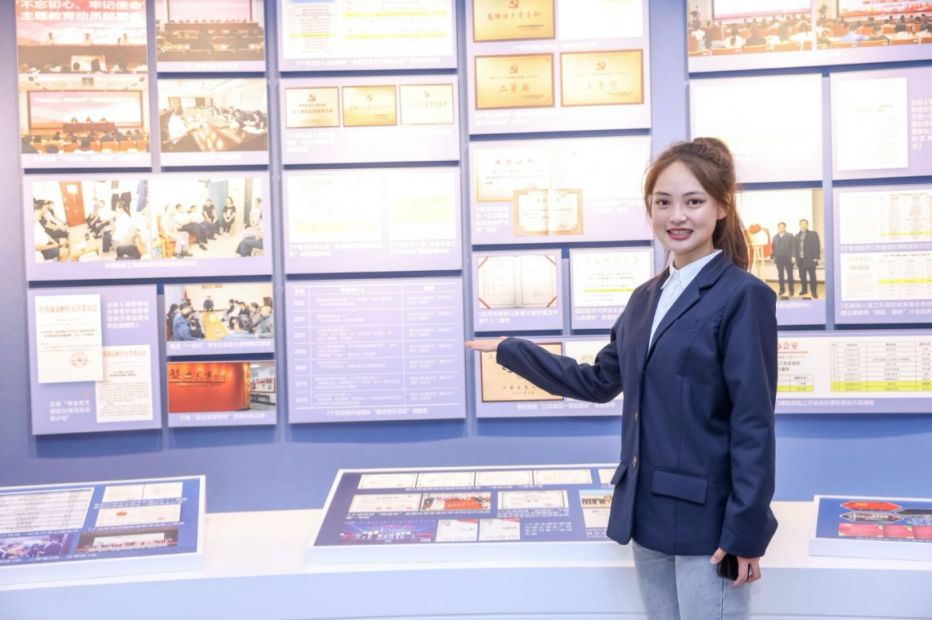 (图为张钰为来访嘉宾介绍南财校史)