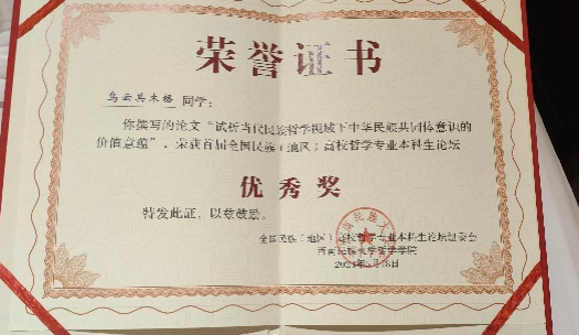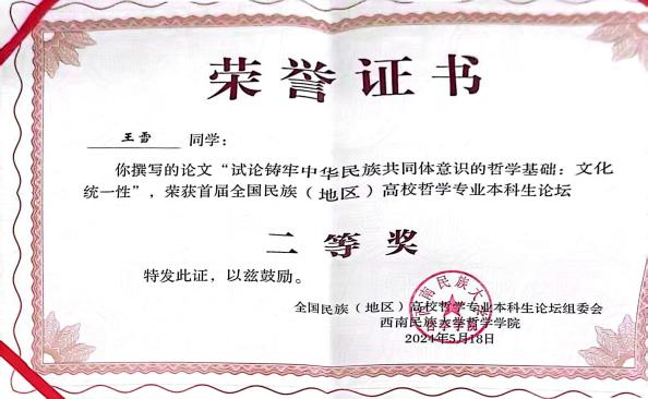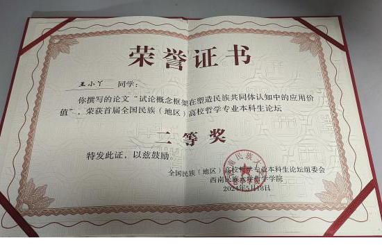米兰官网哲学系本科生王小丫的论文“试论概念框架在塑造民族共同体认知中的应用价值”、王雪荣的论文“试论铸牢中华民族共同体意识的哲学基础:文化统一性”荣获二等奖,乌云其木格的论文“试析当代民族哲学视域下中华民族共同体意识的价值意蕴”荣获优秀奖。