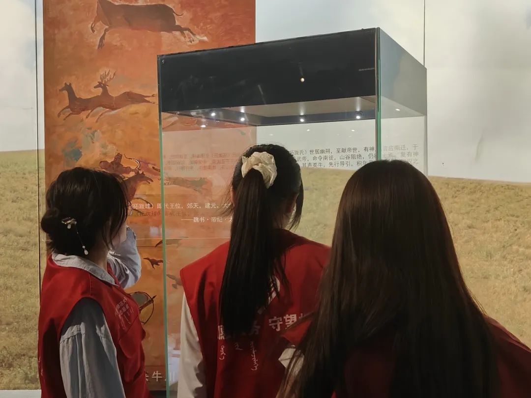 随后,队员们进入“融合之路——拓跋鲜卑迁徙和发展历程”展览厅重点学习,他们认真阅读着文字介绍,互相交流研讨。展厅通过展出与拓跋鲜卑民族相关的历史文物,描绘了拓跋鲜卑民族不同阶段的文明与文化特征,从而呈现出拓跋鲜卑民族的社会演进和发展的时代风貌。在这个展厅的深入学习加深了队员们对中华文明向心力、凝聚力及中华民族多元一体文明的认知。