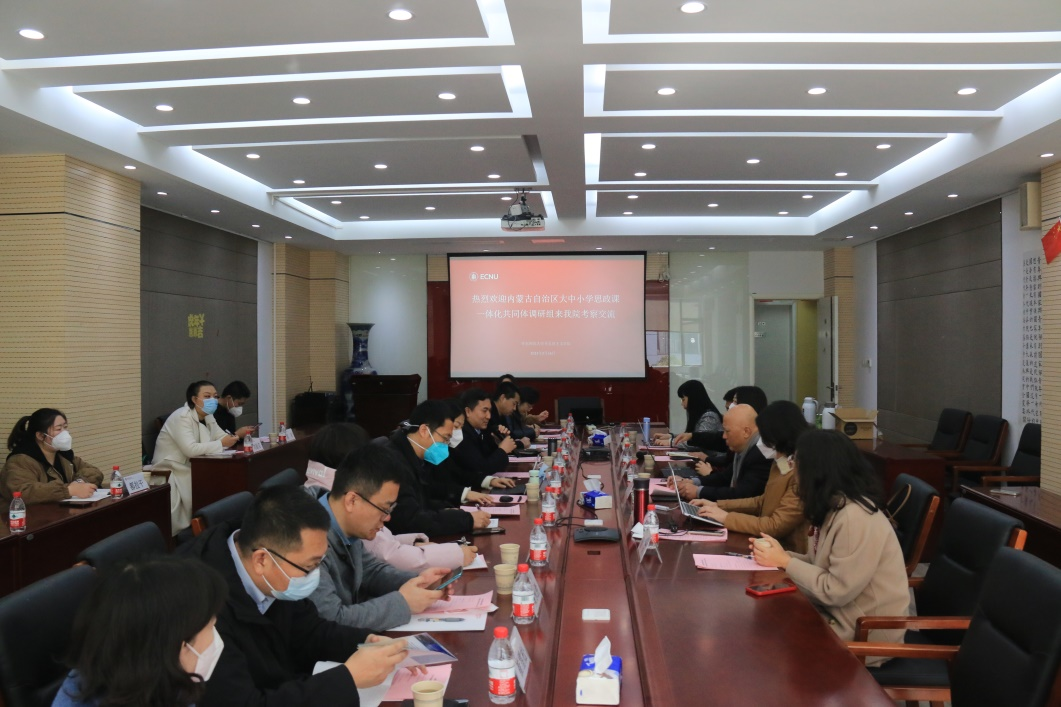 2月16日上午,调研组一行来到华东师范大学闵行校区,华东师范大学米兰milan官方网站党委书记赵正桥等人带领调研组参观了华东师范大学党建服务中心、社会主义历史与文献研究院和大中小学思政课一体化教材成果展列室。随后,在座谈会上,自治区教育厅学生处处长王勇代表调研组介绍了本次调研目的及内蒙古自治区大中小学思政课一体化共同体建设情况。上海市教委德育处处长朱敏、华东师范大学米兰milan官方网站党委书记赵正桥、副院长许瑞芳等人就上海市及华东师范大学大中小学思政课一体化共同体建设情况与调研组成员进行了深入交流,着重介绍了课程教学一体化、师资培养培训一体化以及体制机制一体化等方面的典型做法、取得的成效及下一步建设的思路和方向。